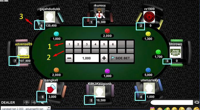 • Jika ingin mengadu dengan player lain anda tinggal klik nomer meja yang ingin diadu lalu klik tombol SIDE BET dengan nilai taruhan minimal sesuai dengan limit meja dan kelipatannya.