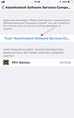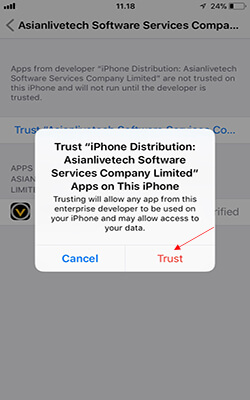 13.Akan muncul pilihan pada perangkat iOS kamu pilhan seperti gambar dibawah ini, klik "Trust" dan kembali lagi ke app PKV Games yang tadi.